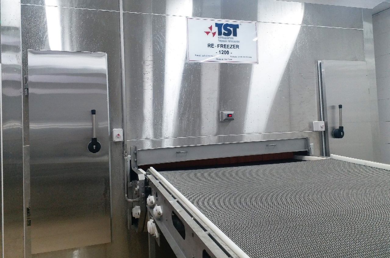 Băng chuyền tái đông có cấu tạo gần giống với một băng chuyền IQF dạng thẳng (Tunnel) nhưng thường ngắn hơn và công suất lạnh thấp hơn (do tải nhiệt chỉ tập trung ở bề mặt).